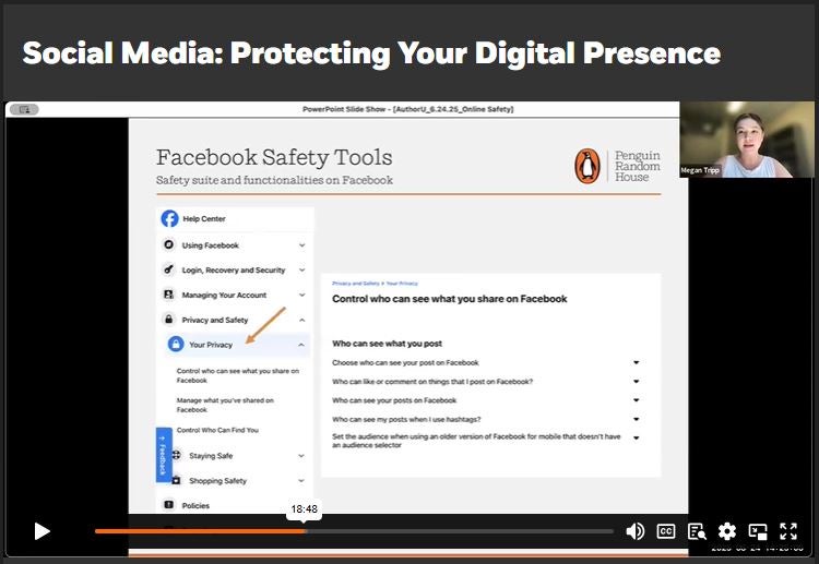 Megan Tripp, Associate Director of Social Media at Penguin Random House, shares a presentation featuring best practices for several social media platforms and how to protect yourself online in these spaces. You can find resources from Megan’s deck here.